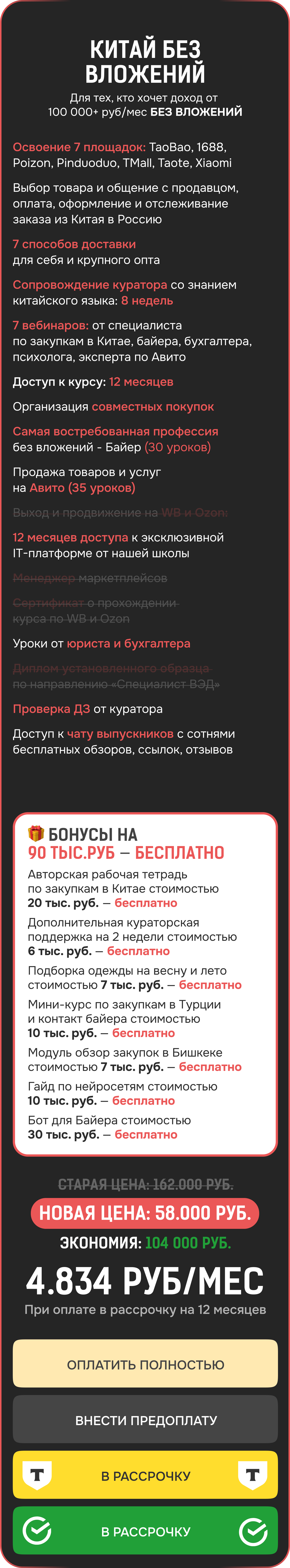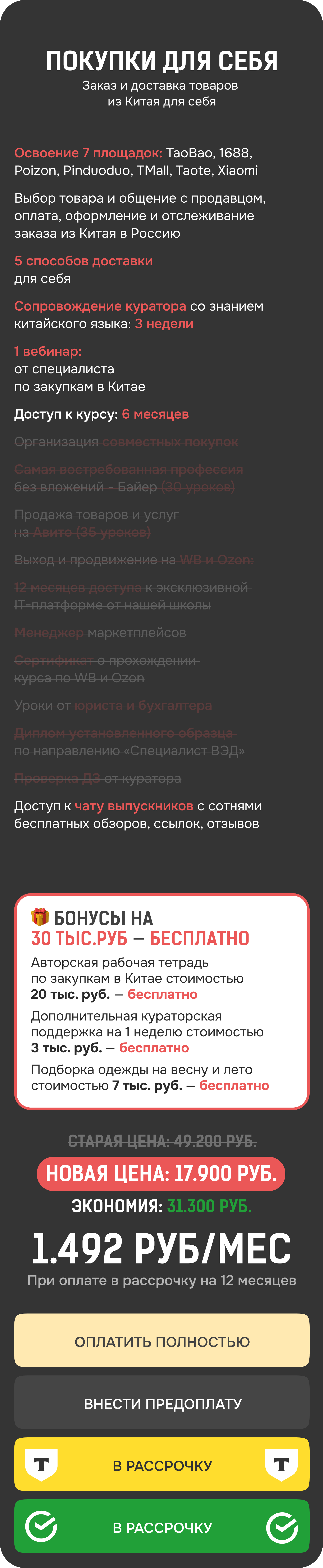 Мы даем контакты проверенных логистических компаний в Россию, Армению, Кыргызстан, Казахстан, Белоруссию. Также некоторые китайские маркетплейсы доставляют товары напрямую, в такие страны как: Сингапур, Макао, Гонконг, Малайзия, Австралия, Новая Зеландия, США, Канада. Если вы из другой страны, то вы можете присоединиться к курсу, однако найти компанию, которая доставит вам ваш груз, нужно будет самостоятельно.