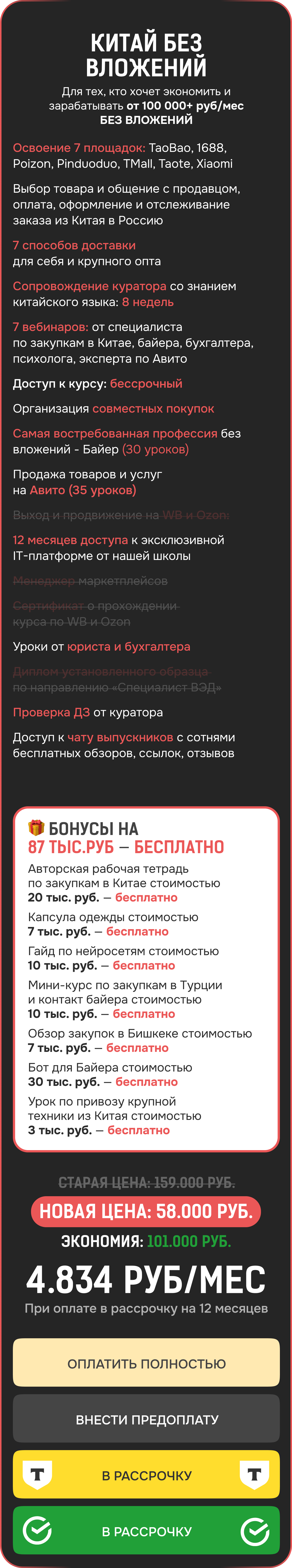Мы даем контакты проверенных логистических компаний в Россию, Армению, Кыргызстан, Казахстан, Белоруссию. Также некоторые китайские маркетплейсы доставляют товары напрямую, в такие страны как: Сингапур, Макао, Гонконг, Малайзия, Австралия, Новая Зеландия, США, Канада. Если вы из другой страны, то вы можете присоединиться к курсу, однако найти компанию, которая доставит вам ваш груз, нужно будет самостоятельно.